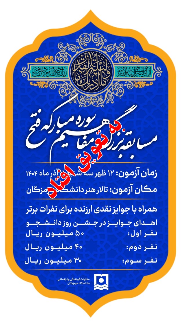 به اطلاع دانشجویان محترم دانشگاه‌ هرمزگان می‌رساند بنا بر تصمیم مدیریت بحران استان مبنی بر تعطیلی دانشگاه‌ها و حفظ سلامت دانشجویان عزیز، زمان برگزاری «مسابقه بزرگ مفاهیم سوره مبارکه فتح» روز سه‌شنبه ۱1 آذر به تاریخ دیگری موکول شد.