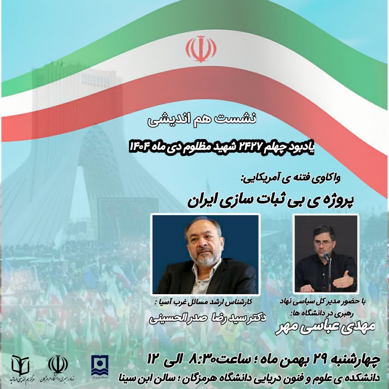 همزمان با چهلم ۲۴۲۷ شهید مظلوم دیماه، نشست تخصصی با عنوان «واکاوی فتنه آمریکایی؛ پروژه بیثباتسازی ایران» ویژه اساتید و اعضای هیئت علمی در دانشگاه هرمزگان برگزار میشود.