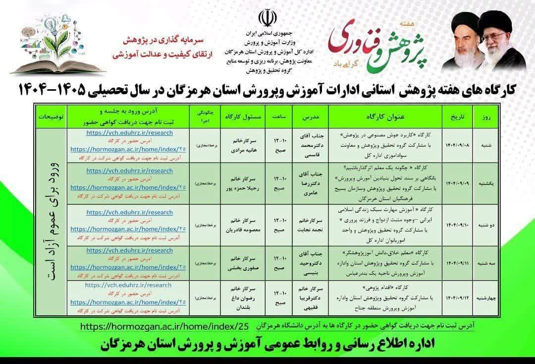 به مناسبت هفته پژوهش و فناوری کارگاه های آموزشی و دانش افزایی ویژه فرهنگیان و معلمان محترم استان هرمزگان با همکاری دانشگاه هرمزگان برگزار می گردد؛